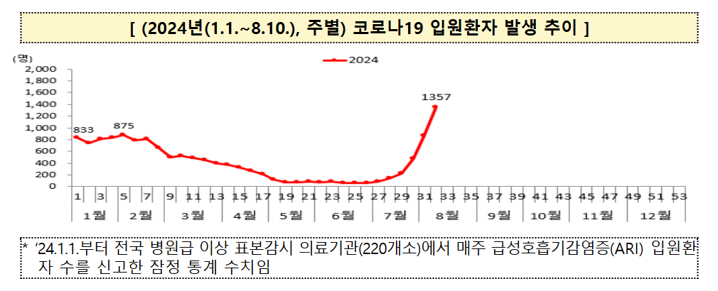 올해 코로나19 입원환자 수는 6월 말부터 다시 증가하는 추세로, 8월 2주 차 입원환자 수는 1,357명(잠정)으로 올해 들어 가장 높은 수준을 기록했는데요.