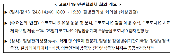 질병관리청은 14일 오후 6시에 정부와 학계 및 의료계 전문가들이 합동으로 첫 번째 코로나19 민관협의체 회의를 열고, 여름철 코로나19 유행 대응 상황과 감염 예방 수칙 등을 논의했습니다.