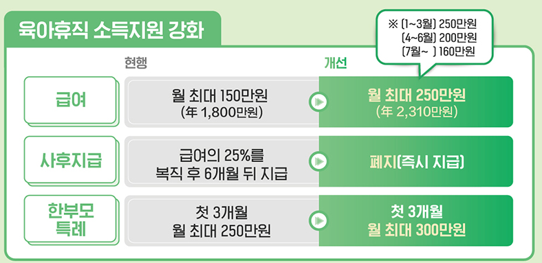 육아휴직 급여는 월 최대 250만 원으로 인상됩니다.